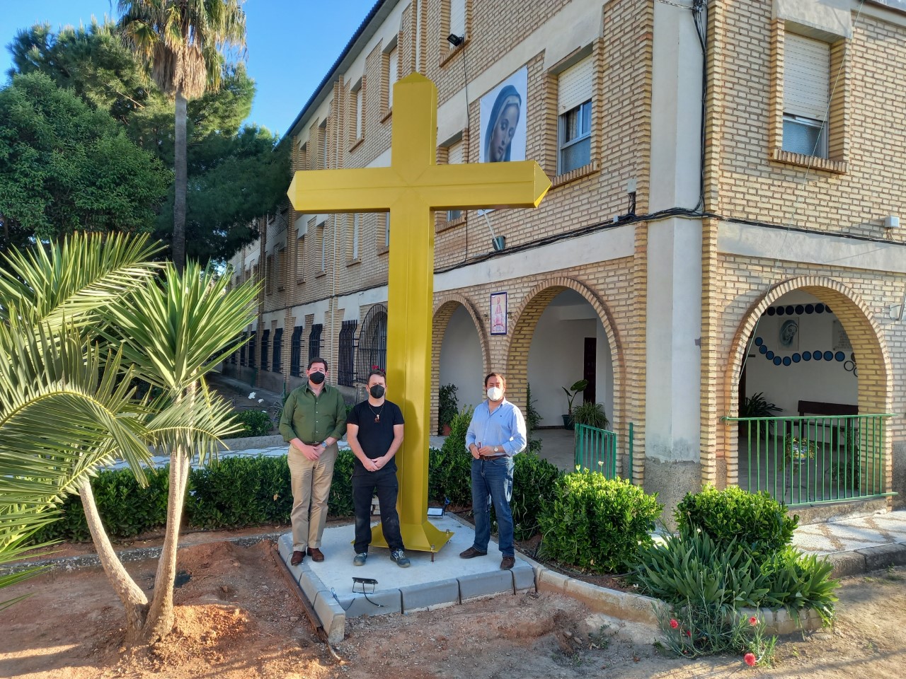 La Cruz que se levanta en el patio del edificio, tiene una altura de casi cinco metros y resulta muy llamativa, ya que puede contemplarse desde la propia Plaza por encima del perímetro del recinto.